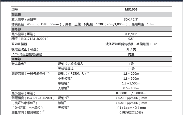 IACS 測角技術(shù)、RED-tech EX 測距技術(shù),并且具備兩大特點(diǎn):高精度、高性價(jià)比。高精度無疑是代表著MS 系列全站儀突出的優(yōu)點(diǎn)所在,0.5″的測角精度以及