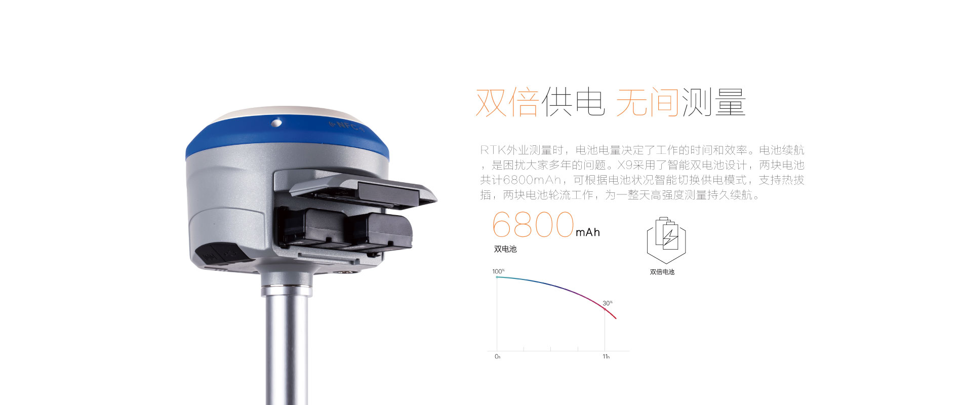 RTK模式12小時(shí),可外接直流電,雙電池電源自動(dòng)切換